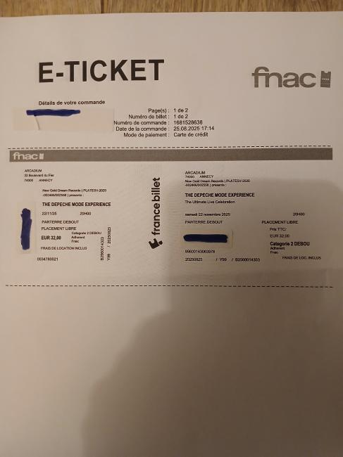 Vends 2 places concert "The Depeche Mode Experience", à l'Arcadium d'Annecy le 22/11/25 . Places parterre debout. Prix initial 32x2 = 64 euros, vendues 50 euros.