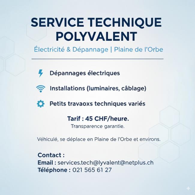 Je suis un professionnel expérimenté en électricité et services techniques, résidant dans la belle région de la Plaine de l'Orbe. Fort de nombreuses années de pratique et d'une solide expérience acquise sur le terrain dans divers domaines, je suis là pour répondre à vos besoins avec efficacité et sérieux.