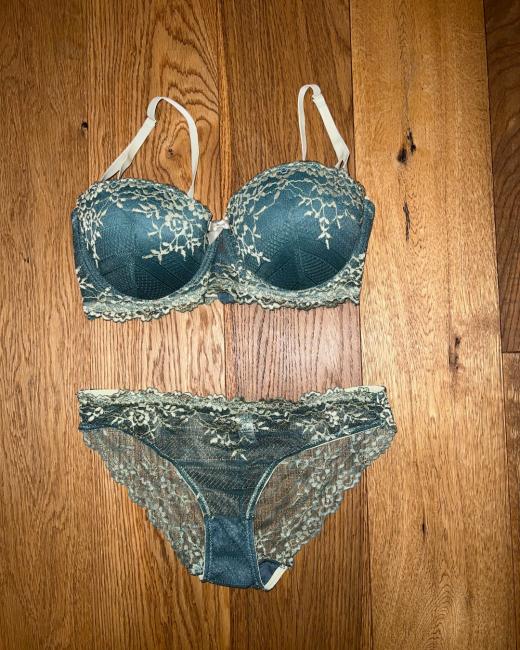 Joli ensemble bleu-vert un peu trop petit pour mes formes. Mis pendant une journée et petit plaisir coquin le soir dedans