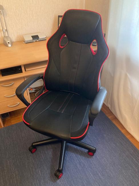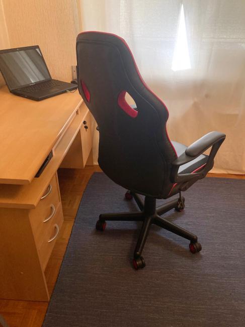 Je vends cette chaise de bureau pivotable, en similicuir et tissu, comme neuve, très peu utilisée, à moitié prix (80 francs)